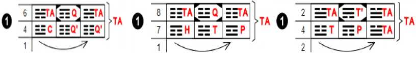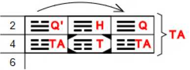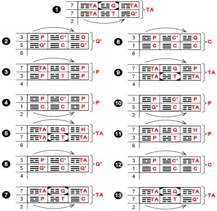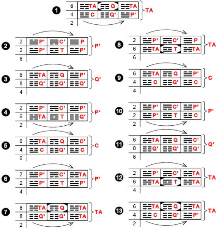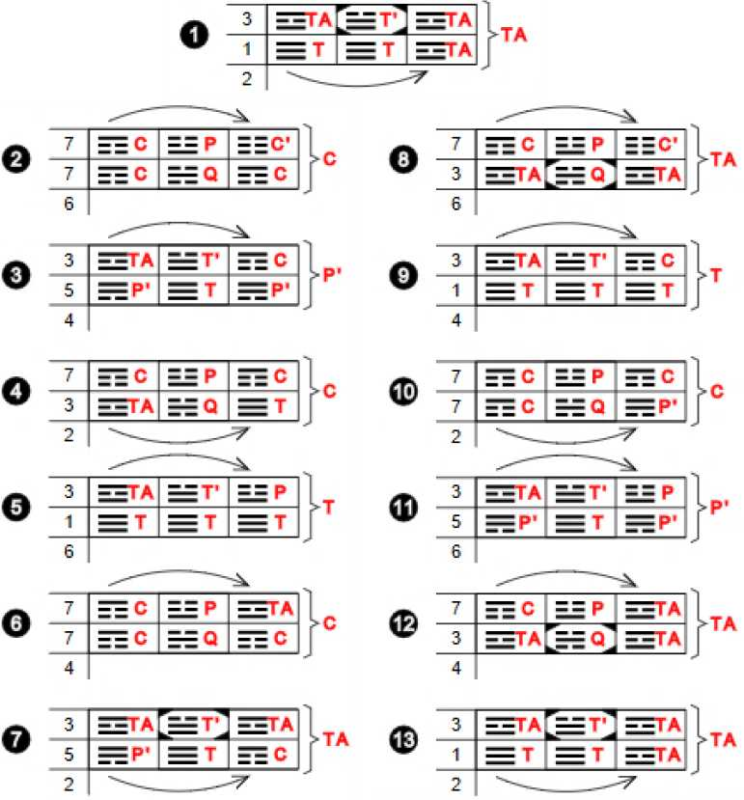 Bảng quái kiện cho thấy ĐỜI TA có tới 12 sự kiện (không thời sự 13 không tính vì lặp lại khởi đề) tuần tự xảy ra : sự Q’ ở không thời 2; sự P ở hai không thời 3, 4 ; sự TA ở không thời 5; sự Q’ ở không thời 6, sự TA ở không thời 7, sự C ở không thời 8, sự TA ở không thời sự 9, sự P ở không thời 10, 12; sự C ở không thời 12.