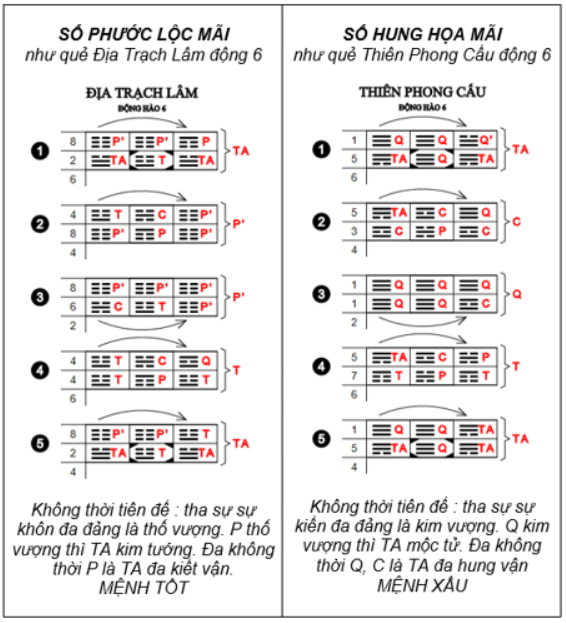 Chánh quái động hào 1, động hào 4 cho 9 không thời. Chánh quái động hào 2, động hào 5 cho 13 không thời. Nhiều không thời sự là nhiều đa đoan đưa đầy TA thăng trầm, ấy nên sự đời cho thấy người sang giàu bỗng nghèo cháy túi, kẽ bần hàn rớt mồng tơi bỗng giàu nứt vách, lại có kẽ bình bình nghèo chẳng ra nghèo mà giàu chẳng ra giàu. Chánh quái động hào 3, động hào 6 cho 5 không thời mà TA bất biến thì trước sau không thay đổi vận, ấy nên người sang sang mãi, người bần bần cùng hoài là vậy. Như hai quẻ Địa Trạch Lâm với Thiên Phong Cấu bên dưới: