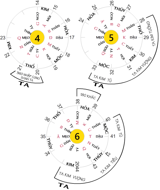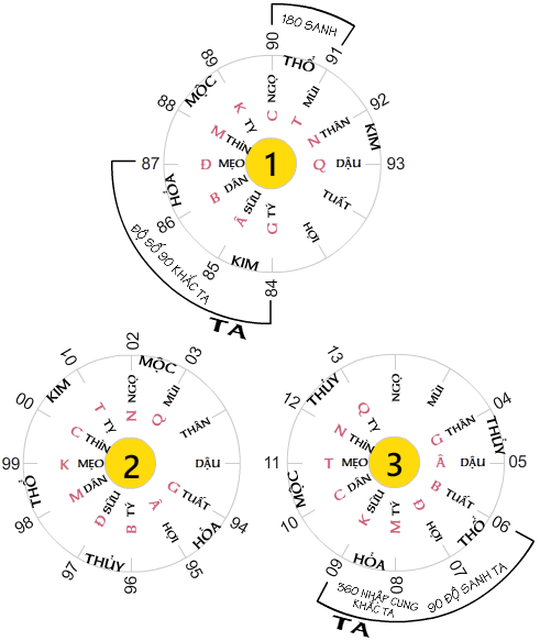 TA KIM làm dụ mẫu, bốn Mệnh hành Thủy, Mộc, Hỏa , Thổ được bị ba thứ độ số ấy sanh khắc. Ngũ hành vận trù với chu kỳ 6 nhà giáp. Mệnh hành sanh thuộc Giáp 1 : chiệu ảnh hưởng bởi giáp [ 1.2.3.4.5.6 ]. Mệnh hành sanh thuộc Giáp 2 : chiệu ảnh hưởng bởi giáp [ 2.3.4.5.6.1 ]. Mệnh hành sanh thuộc Gáp 3 : chiệu ảnh hưởng bởi giáp [ 3.4.5.6.1.2 ]. Mệnh hành sanh thuộc Giáp 4 : chiệu ảnh hưởng bởi giáp { 4.5.6.1.2.3 ]. Mệnh hành sanh thuộc Giáp 5 : chiệu ảnh hưởng bởi giáp [ 5.6.1.2.3.4 ]. Mệnh hành sanh thuộc Giáp 6 : chiệu ảnh hưởng bởi giáp [ 6.1.2.3.4.5 ].