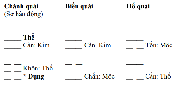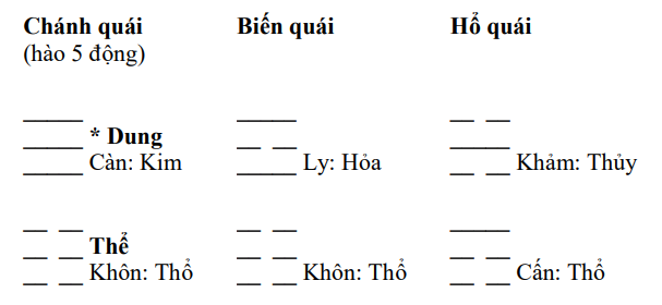 Xem toàn quái nên gồm cả Hổ quái, Biến quái, còn ngũ hành là: Ly thuộc Hỏa chủ trời tạnh; Khảm thuộc Thủy chủ trời mưa; Khôn thuộc Thổ là khí đất chủ u ám; Càn là trời chủ tạnh ráo; Chấn là sấm; Tốn là gió.