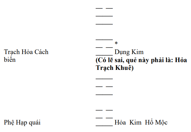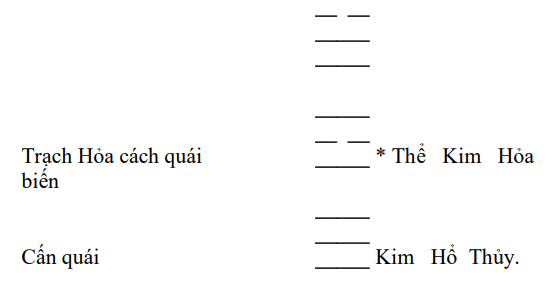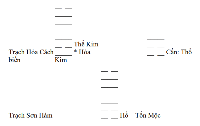 Quẻ này là Trạch Hỏa Cách là thiếu nữ, vật gần là Khẩu (miệng), vật xa tượng trưng cho Dương (dê); Nội Ly là trung nữ, vật gần là Mục (con mắt), vật xa là Trĩ (chim trĩ). Sơ hào biến Cấn quái là Thổ; Thổ năng sinh Kim, thì giúp cho Đoài là em thứ; trừ bỏ sơ hào, dời lên tứ hào lại thành Tốn Mộc, vì vậy mới bị thương ở vế, nhờ được sơ hào biến cấn Thổ; Thổ sinh Đoài Kim, cho nên chỉ bị thương không đến nỗi thiệt mạng.