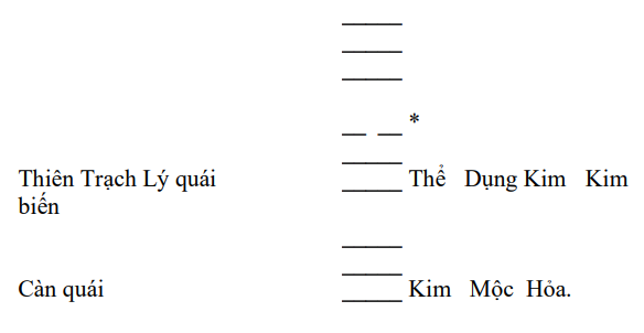 Thể Dụng là do ở vị trí biến hào, rồi mới phân định ra Động và Tịnh. Đọng ấy là quẻ Dụng, Tịnh ấy là quẻ Thể. Lại như Ly là tứ quái, Càn là cửu quái, Khảm là tam quái, Tốn là thất quái, Khảm là bát quái, Đoài là nhị quái, Chấn là ngũ quái, Cấn là nhị quái và Tốn là lục quái.