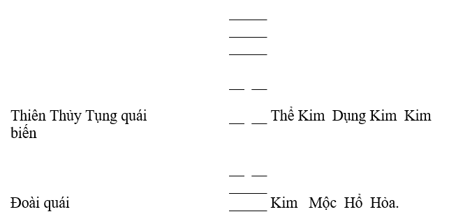 Thiên Thủy Tụng quái, biến Đoài vì muốn cầu tài, nhận thấy Thể quái sinh, cho nên khí bị lộ ra ngoài, thế là tài không có, lại nữa gặp quẻ Ly là Hỏa khắc Kim. Như vậy là ngày ấy, giờ Ngọ, có khách tới ăn, yêu sách rượu, rồi trở thành tiêu hao vậy.