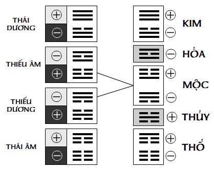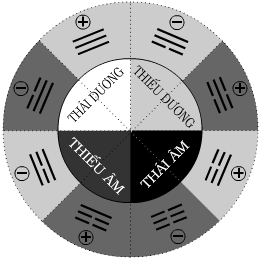 Cái một âm, cái một dương ( tức dương nghi, âm nghi ) lưỡng phân thành hai cái một âm dương đối tánh mà âm dương chiếm vị trong cái một đã lưỡng phân ra nó theo qui luãt “dương thượng âm hạ” thành ra 4 cái một là thái dương, thiếu âm, thiếu dương, thái âm :
