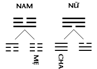 Để có tuần hoàn sanh hóa thì trong cái nọ phải có tượng của cái kia, trong cái kia phải có tượng của cái nọ mới thành vòng nọ kia kia nọ. Bảng biểu quái lưỡng phân cho thấy [ trong Ly có Khảm trong khảm có Ly ] thành nhau bằng vòng hai thì, hay như [ trong Kiền có Đoài trong đoài có Ly trong Ly có Tốn trong Tốn có Kiền ] thành nhau bằng vòng 4 thì, hay như [ trong Chấn có Khôn trong Khôn có Cấn trong Cấn có Khảm trong Khảm có Ly trong Ly có Tốn trong Tốn có Kiền trong Kiền có Đoài trong Đoài có Chấn ] thành nhau bằng vòng 8 thì. Lý dịch như vậy đó mới ứng ra [ trong trứng có tằm, trong tằm có nhộng, trong nhộng có bướm, trong bướm có trứng, trong trứng có tằm nhộng bướm trứng ] mới có vòng sanh hóa “ tằm nhộng bướm trứng tằm ”. Cũng vậy [ trong xuân có hạ, trong hạ có thu, trong thu có đông, trong đông có xuân ] mới thành ra vòng “ xuân hạ thu đông xuân ”,vật lý mới có vòng ” nước hơi, hơi nước “, điện từ mới có vòng ” từ điện, điện từ “. Bởi bát quái ứng sanh vạn vật nên chi khắp giáp trong vạn hữu đâu đâu cũng thấy bóng dáng bát quái lưỡng phân, hệ nhị phân đó : cơ bản từ 64 quẻ dịch Gottfried Leibniz khái niệm ra, còn DNA 64 CODON lưu trữ quá khứ hiện tại tương lai đang được lục thập tứ quái làm sáng tỏ di truyền. Dân gian Việt có câu “ gái nhờ đức cha, trai nhờ đức mẹ ” là lời toán pháp trầm mình, phản ánh tư duy âm dương hợp hóa nếp sống, kìa xem bảng biểu lưỡng phân : trong TỐN có KIỀN, trong CHẤN có KHÔN tức trong tốn nữ có di thể kiền cha, trong chấn nam có di thể khôn mẹ  :