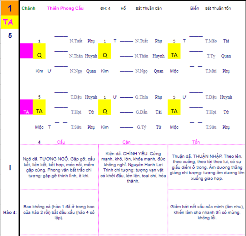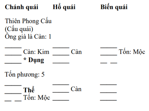 Tiên sinh lấy Càn là ông già, đặt làm Thượng quái, Tốn phương làm Hạ quái thì được quẻ Thiên Phong Cấu. Lấy Càn là 1, Tốn là 5, gia thêm giờ Mão số 4 tổng cộng: 10 , 6 = 4 tức là hào 4 động, gọi là Thiên Phong Cấu chi cửu tứ.