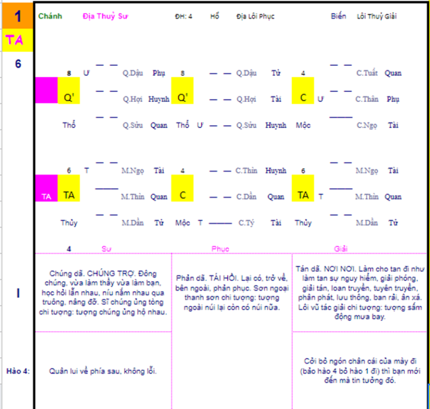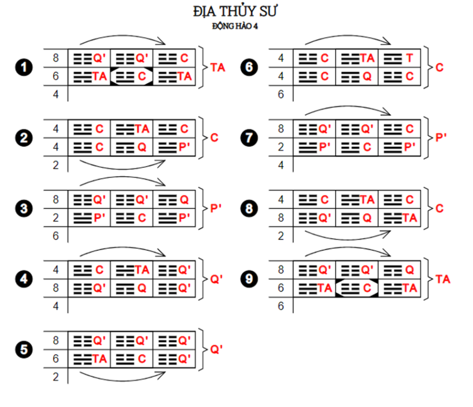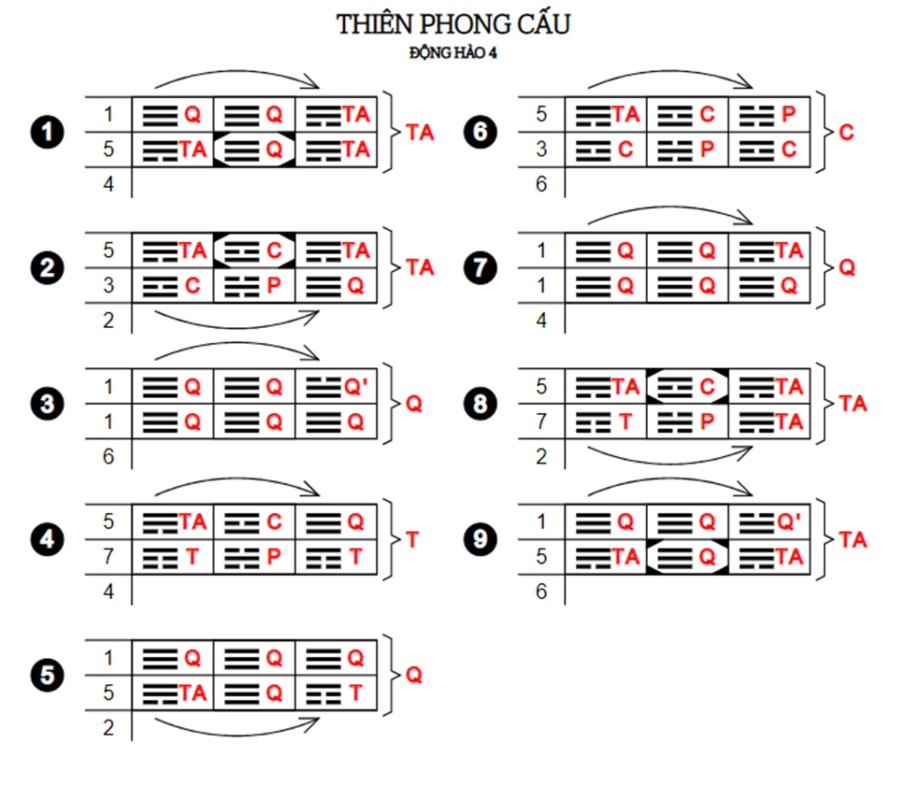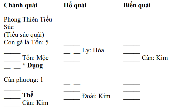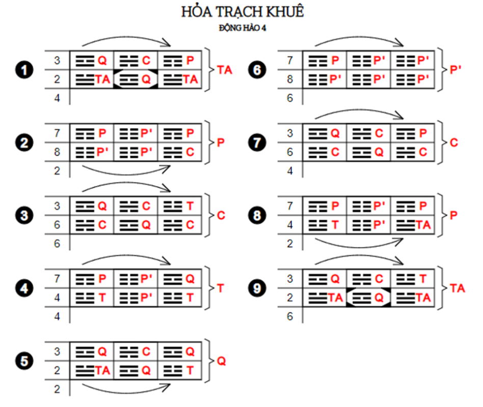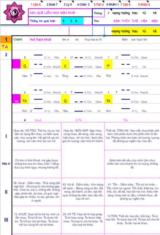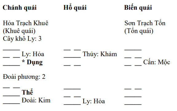 - Đoài số 2, Ly số 3, gia thêm giờ Thìn số 5, cộng tất cả là 10. 10 , 6 (1 lần 6) = 4, tức là hào 4 động, biến Sơn Trạch Tổn, gọi là Khuê chi cửu tứ.