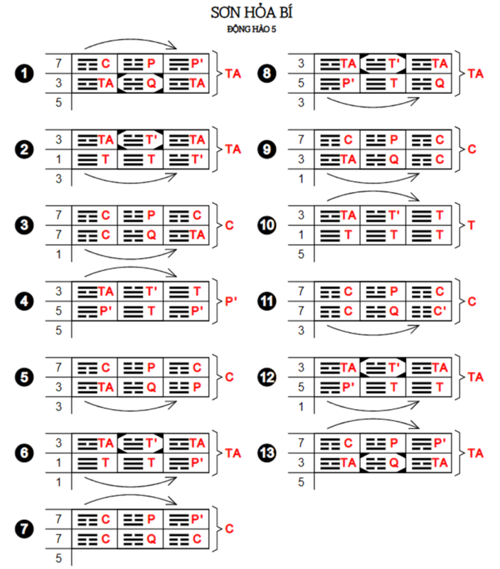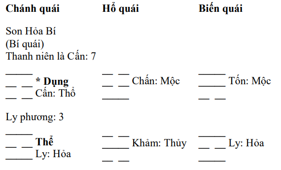 Cấn là số 7, Ly là số 3, giờ Ngọ là số 7. Cộng tất cả là 17; 17 , 12 (2 lần 6) = 5; tức là hào 5 động. Quái gọi là Bí Chi Lục Ngũ.