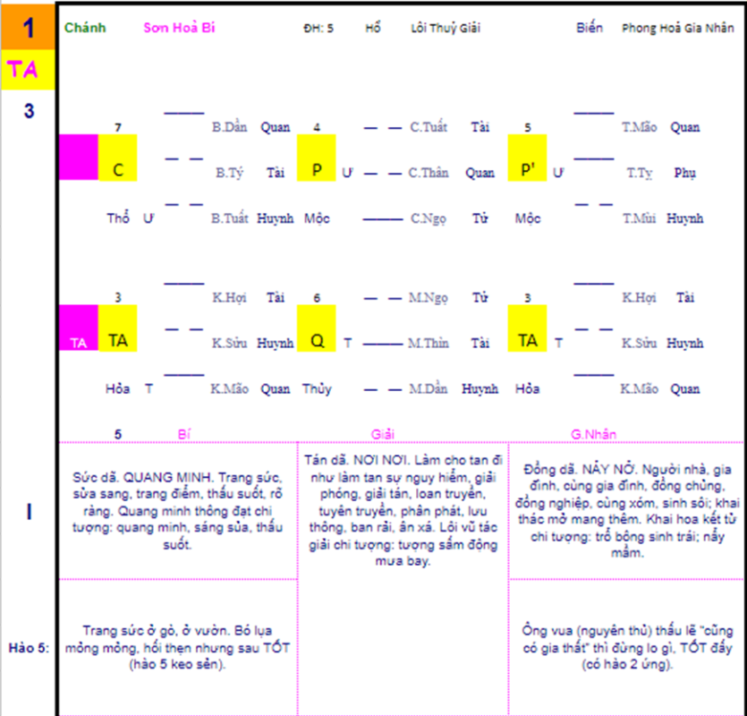 Hào từ bảo rằng: “Bí ư khâu viên, thúc bạch tiễn tiễn cái” nghĩa là: Bó lụa, bông hoa văn sức ở chốn khâu viên, như vậy là Dịch từ đã tốt, mà lại được quẻ Bí biến thành quẻ Gia Nhân (Phong Hỏa Giai Nhân), Hổ quái thấy Chấn Khảm: Ly là Thể, Hổ Biến đều sinh Thể hết.