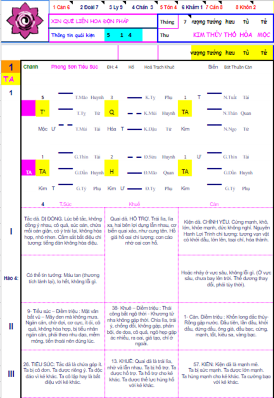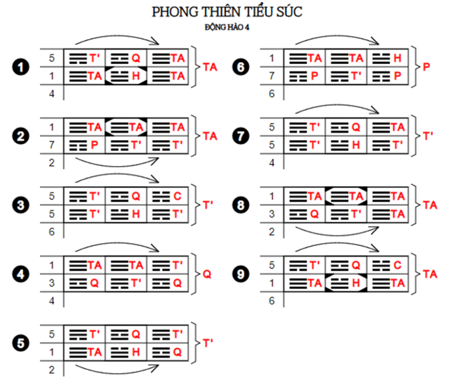 - Lấy Tốn là 5, Càn là 1, gia thêm giờ Mẹo là số 4, cộng tất cả được 10. 10 , (1 x 6)= 4 tức là hào 4 động, biến thành quẻ Càn gọi là Tiểu Súc lục tứ.