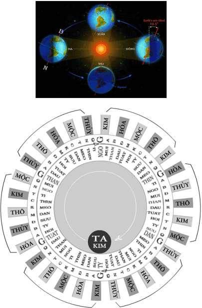 Một năm thì là vòng ấy có tứ thời âm nóng mát lạnh, một ngày cũng là vòng ấy có sáng trưa chiều tối đối cảm. Hỏi lý gì lấy 1 ở DẦN để khởi tính tháng ? Lẽ thứ nhất vì Dần ở đầu Chấn quái mà Chấn quái thành tượng do dương sinh trưởng. Lẽ thứ hai dương khí sau một vòng biến thiên quay về hồi phục ở Chấn. Lẽ thứ ba Chấn quái hành Mộc có tượng sự sống phát khởi bởi lý đó mà Dần khởi đầu tứ sinh cung. Từ Dần kề 1 thì Mẹo 2 Thìn 3 đến 12 Sữu. Ba tháng thành mùa thì mùa xuân kể một, Hạ kể hai, mùa Thu kể ba, mùa Đông kể bốn. Trung cung Thổ ứng ra tứ phương Thìn Tuất Sửu Mùi nên bốn tháng đó nhận thêm hành thổ mà Thìn Tuất dương thổ, Sửu Mùi âm thổ. Ngũ hành xuất nhập qua trung cung, mọi vật qui về thổ nên chi Thìn Tuất Sửu Mùi là tứ mộ cung. Hỏi lý gì lấy 1 ở Tý để khởi tính Năm ? Lẽ tự nhiên thứ nhất là Tý điểm gốc địa cầu. Lẽ tự nhiên thứ hai là tháng đông chí ở Tí. Lẽ tự nhiên thứ ba bởi dương sanh ở Tí để sau một chu kỳ 12 tháng lặp lại khí dương sinh mà dương chủ nên chi lấy Tý làm mốc khởi tính năm. Một năm là vòng ấy, một ngày cũng là vòng ấy nên chi giờ cũng lấy Tý mà kể một.