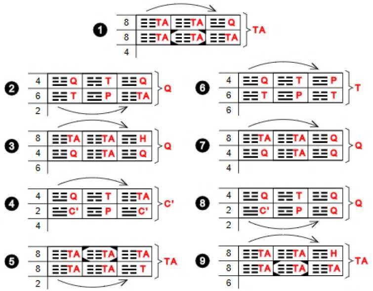Lấy lý mà suy thì TA KHÔN trong quẻ này có nguy khốn bên ngoài, nhưng thiệt mạng hay bị tù tội thì ắt không xảy ra. Tuy nhiên vì không có chủ sự PHỤ xuất hiện để hóa giải Quan sự, nên TA Khôn khó có cơ hội thoát hiểm nhanh chóng, bảng quái kiện tới 9 không thời sự là sự việc kéo daì qua nhiều giai đoạn, kiên trì đợi thời suy của Quan sự ắt quan sự tự rút lui. Xét 4 không thời Quan Chấn thấy rõ lúc đầu Chấn quan rất vượng ở không thời 2 vì có Khảm thủy sanh Chấn mộc, và giữ được thế ở không thời 3, 7 đến không thời 8 thì cái thế của Chấn quan bị Đoài kim khắc Chấn Mộc, mà Đoài Kim đã rất vượng từ không thời 4 chủ sự C khiến Quan Chấn phải rút lui. Tại không thời 9 là không thời kết không còn Chấn Quan, TA KHÔN biến CÂN là Khôn trướng lên biểu tỏ sự chiến thắng của TA Khôn. Sau một hồi chiêm nghiêm quái kiện, tôi viết lời đoán << hung sự rút lui, không bị tù, phòng tật bệnh >>.