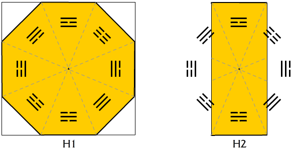Đại để tốt xấu là vì cái bộ máy bát quái đòi hỏi không gian đất đủ chỗ để phối trí tám quái ( biểu đồ H1 ), nhưng với thế đất đầu voi đuôi chuột là không đủ chỗ an định bát quái đúng kích cỡ mô hình ( biểu đồ H2 ) làm cho bát quái hoạt động bất bình thường bởi tám quái có quái thừa quái thiếu ví như hai biểu đồ dưới :