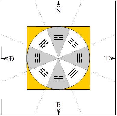 Người quan sát từ bên trong đồ nhìn ra : cạnh thẳng góc với tia nhìn là mặt tiền nhà hướng về phương đó. Mỗi hướng nhà mang tên một cung quái mà cung này là PHI CUNG của gia chủ tức người chủ căn nhà. Có tám phi cung nên chi có tám hướng nhà theo phi cung gọi là BÁT TRẠCH :