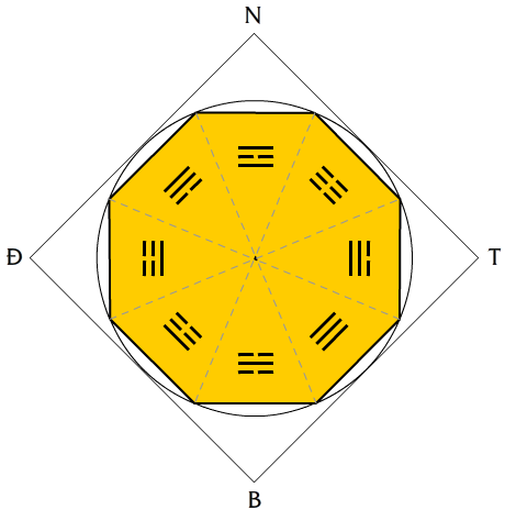 Giác cạnh hướng về Nam là mặt nhà cung LY. Giác cạnh hướng về Bắc là mặt nhà cung Khảm. Giác canh hướng về Đông là mặt nà cung Chấn. Giác cạnh hướng về Tây là mặt nhà cung Đoài. Giác cạnh hướng về Đông Nam là mặt nhà cung Tốn. Giác cạnh hướng về Tây Nam là mặt nhà cung Khôn. Giác cạnh hướng về Tây Bắc là mặt nhà cung Kiền.