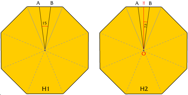 Qua biểu đồ H1 nhận thấy độ rộng AB một sơn hướng cửa 15 độ phụ thuộc vào chiều sâu từ cửa vào tâm O của bát quái. Tâm Bát quái là TÂM NHÀ, vậy giả sử chiều sâu HO từ cửa chính diện vào tâm nhà = 5 mét thì độ rộng cửa được tính như sau :