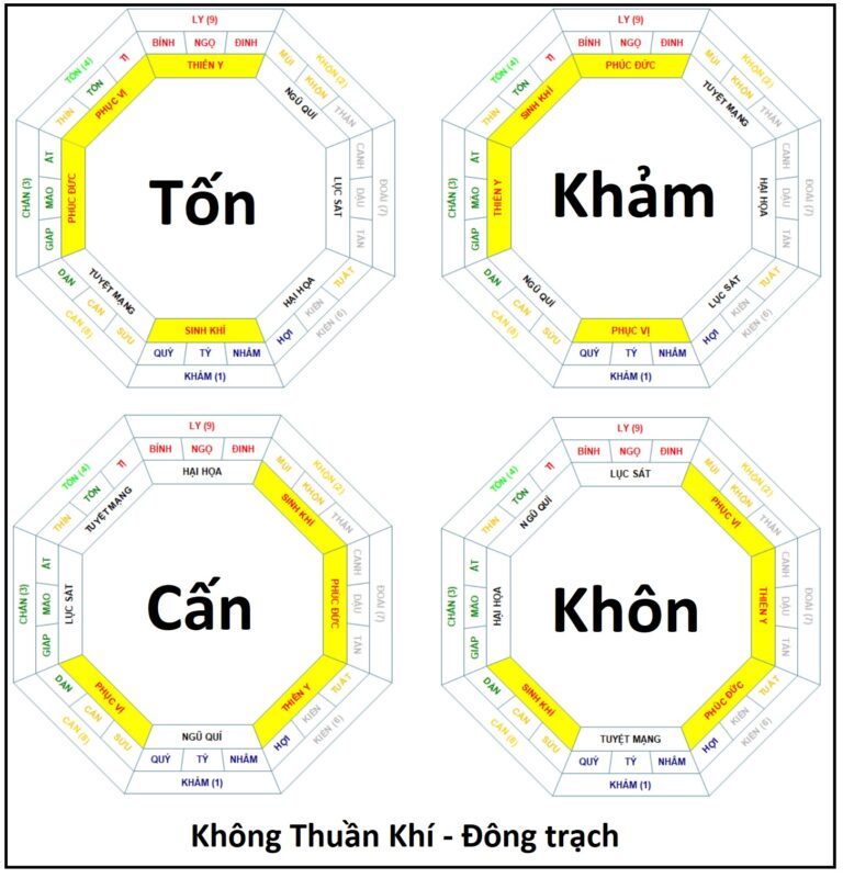 Có 4 hướng Xấu là màu đen, và 4 hướng tốt là màu đổ trong khẩu quyết phối khí trên.