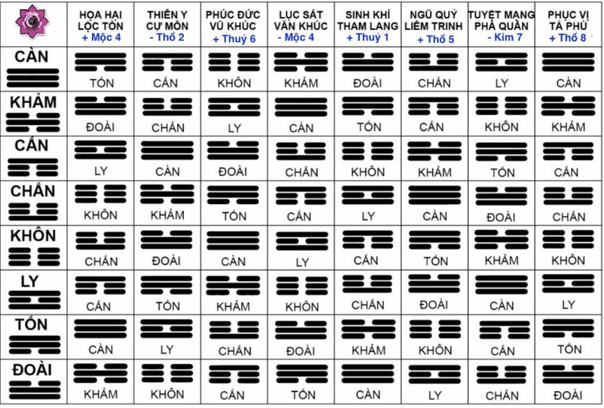 Toàn thể kiến thức của trường phái Phong Thuỷ Bát Trạch được gôm vào bảng tra này. Đây là dân gian các cụ nhà ta hay dùng.