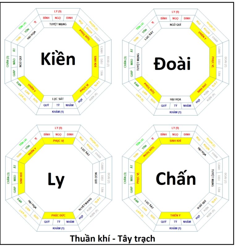 Khẩu quyết phối khí bát trạch: Diên niên = phúc đức, Chữ đỏ tốt chữ đen xấu.