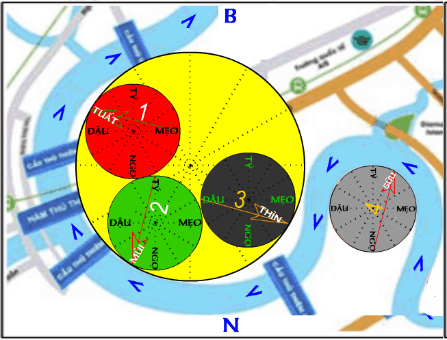 Tại (2) Địa lý gia đứng ở Tý nhìn về Mùi phương thấy dòng chảy vòng từ tay trái sang tay phải, xác định đất này thuộc DƯƠNG MỘC CỤC (Hợi mão mùi) : sao TRÀNG tại HỢI, sao ĐẾ tại MẸO, sao MỘ tại MÙI.