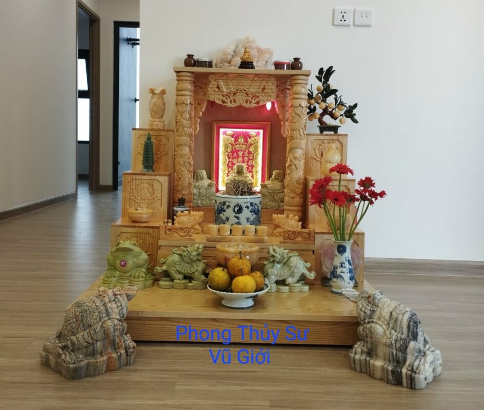 Theo phong tục “Đông bình tây quả”, đặt lọ hoa bên tay phải và đĩa quả bên tay trái (tính từ ngoài nhìn vào).