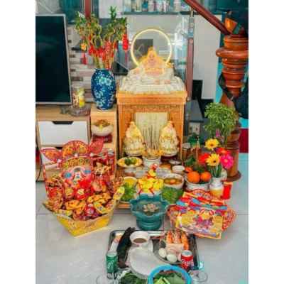 Tín chủ thành tâm sửa biện hương hoa, lễ vật, kim ngân, trà quả và các thứ cúng dâng, bày ra trước án kính mời ngài Thần Tài vị tiền.